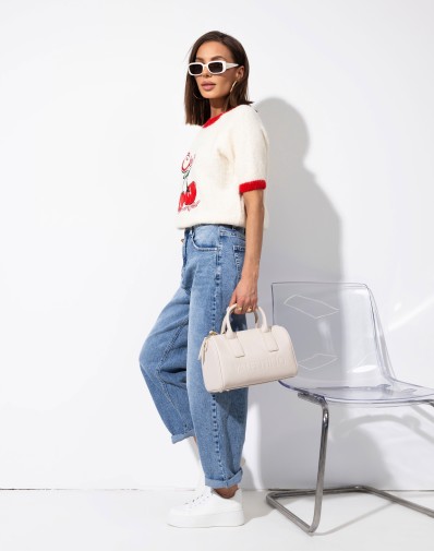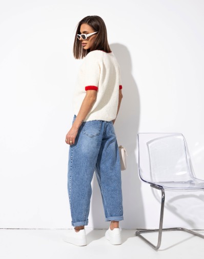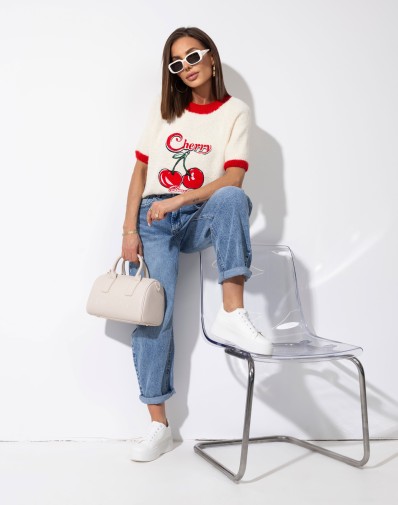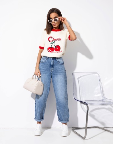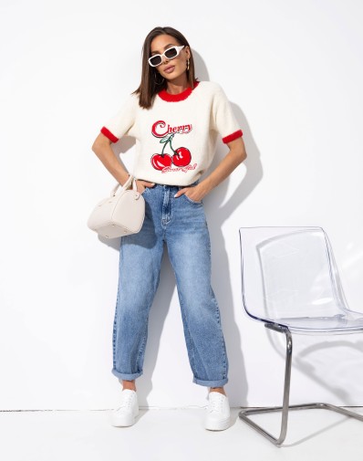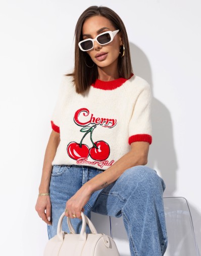 Sweterek z krótkim rękawem o klasycznym kroju, wykończony kontrastową czerwoną lamówką przy dekolcie i rękawkach. Uwagę przyciąga subtelna aplikacja wisienek na środku, która dodaje całości uroku. Idealny do codziennych stylizacji oraz jako akcent w bardziej kobiecym looku.