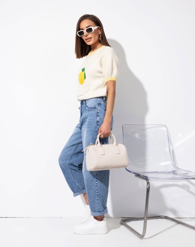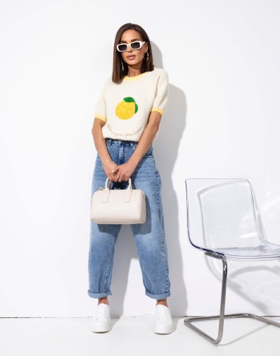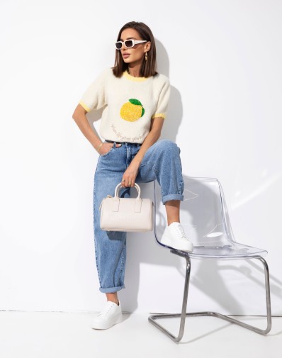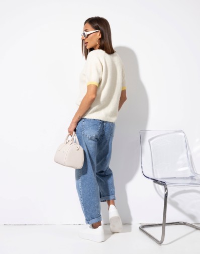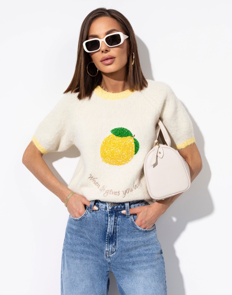 Sweterek z krótkim rękawem o klasycznym kroju, wykończony kontrastową żółtą lamówką przy dekolcie i rękawkach. Uwagę przyciąga cekinowa aplikacja na środku, która dodaje całości uroku. Idealny do codziennych stylizacji oraz jako akcent w bardziej kobiecym looku.