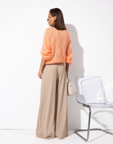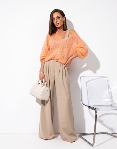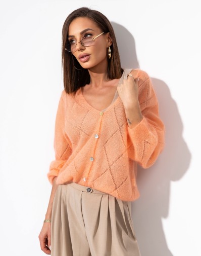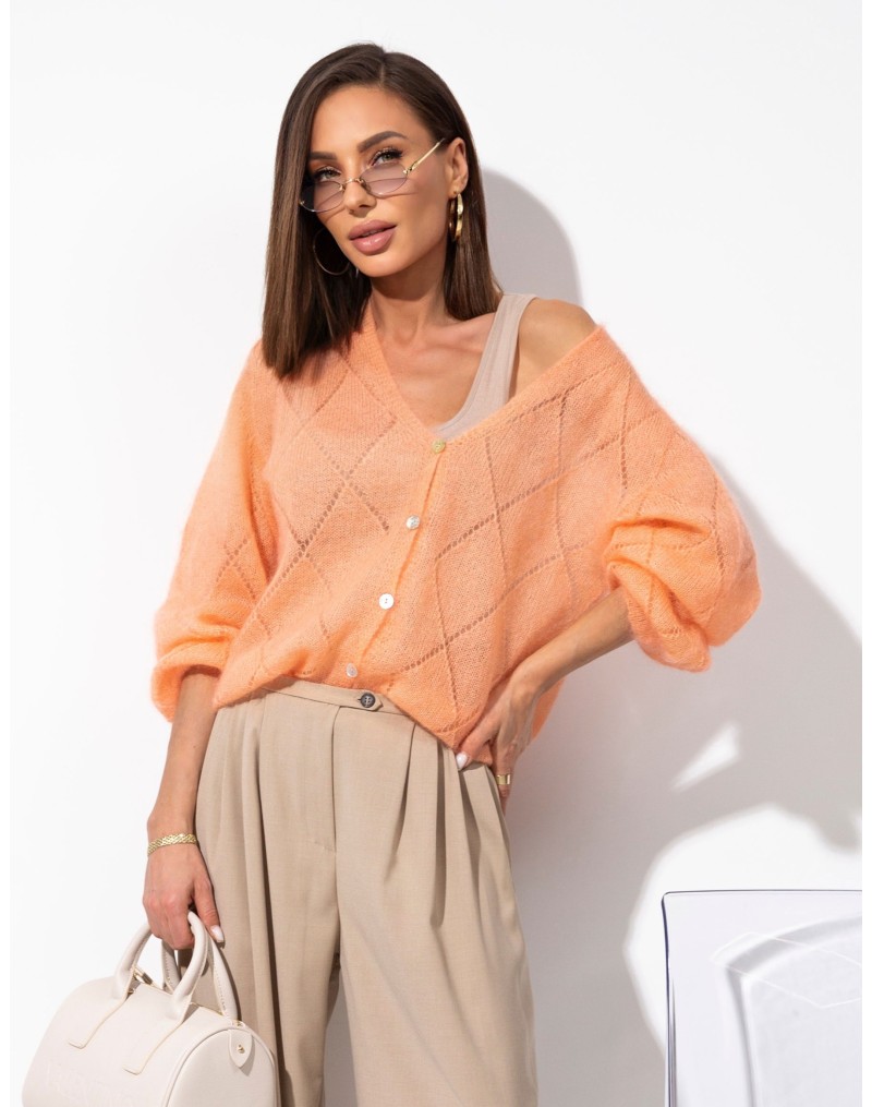 Sweter zapinany na guziki, wykonany z lekkiej i miękkiej dzianiny o dekoracyjnym, ażurowo-prążkowanym splocie. Model z dekoltem w kształcie litery V oraz długim rękawem o luźnym kroju. Delikatna struktura materiału nadaje całości lekkości i kobiecego charakteru.