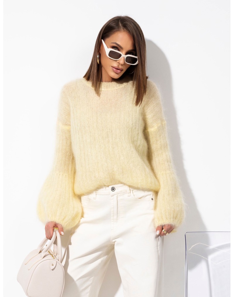 Ten miękki sweter z szerokimi rękawami połączenie wygody i stylu. Wykonany z puszystej, przyjemnej w dotyku dzianiny, zapewnia ciepło i komfort w chłodniejsze dni. Ma luźny fason, a szerokie rękawy zwężane przy nadgarstkach dodają mu nowoczesnego charakteru. Prosty dekolt i delikatne wykończenia sprawiają, że świetnie komponuje się zarówno z jeansami, jak i bardziej eleganckimi spodniami. To idealny wybór dla kobiet, które cenią sobie klasykę w modnym, współczesnym wydaniu.