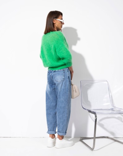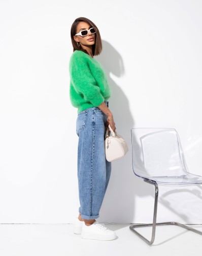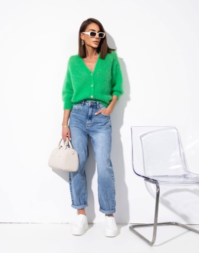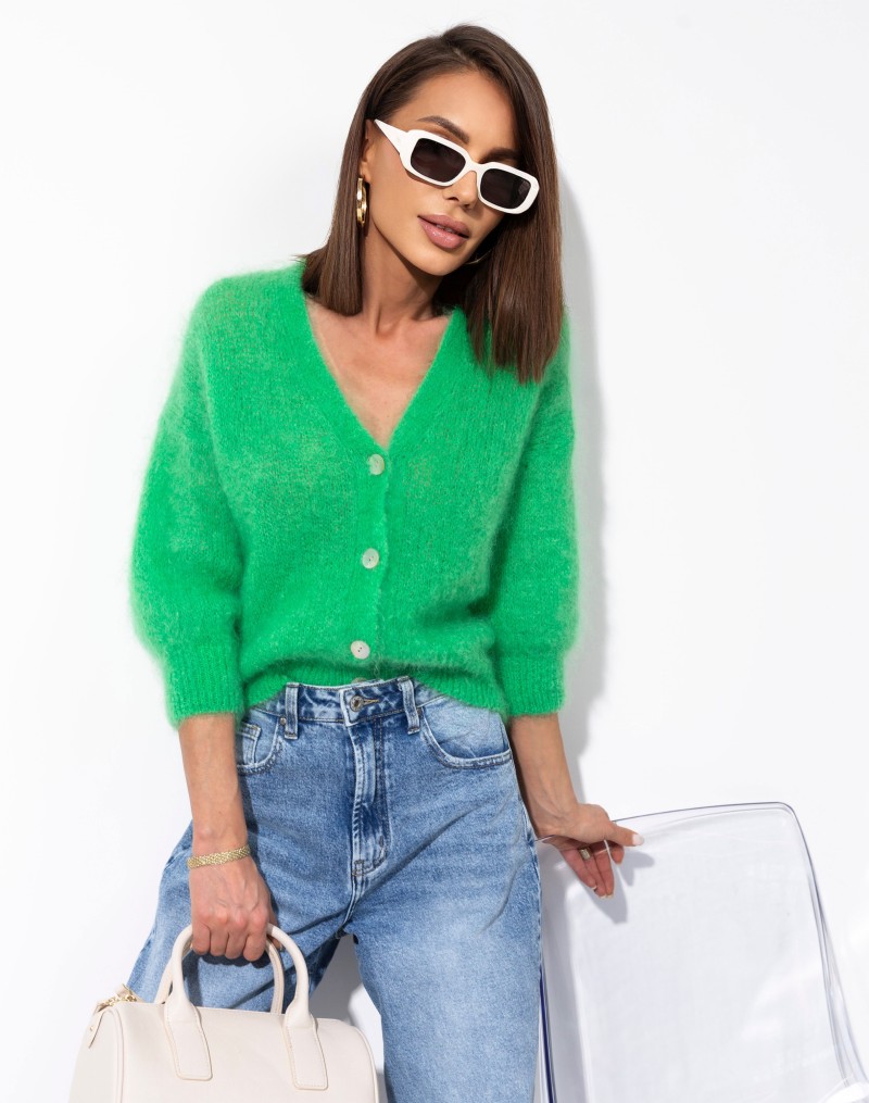 Miękki, zielony sweter zapinany na guziki, wykonany z puszystej, przyjemnej w dotyku dzianiny. Model z dekoltem w kształcie litery V oraz lekko skróconą długością, która świetnie komponuje się z jeansami i spodniami z wysokim stanem. Delikatnie obniżona linia ramion i rękawy o długości 3/4 nadają mu swobodnego, nowoczesnego charakteru. Idealny wybór na codzienne stylizacje z nutą koloru.