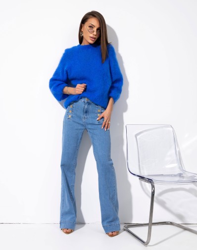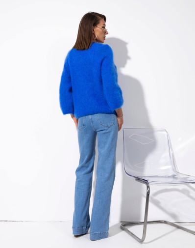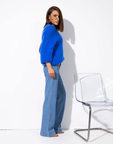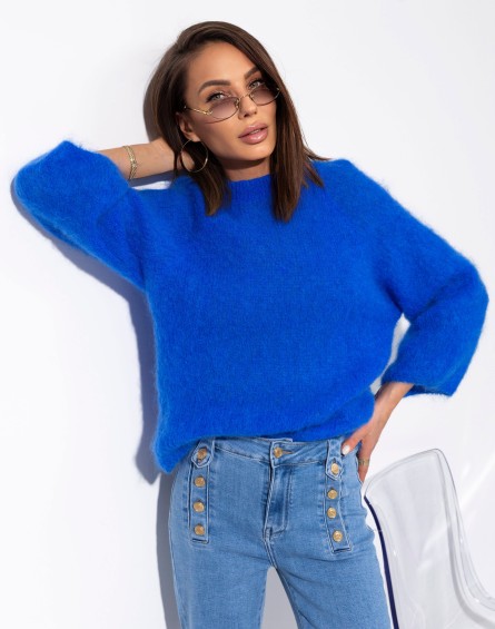 Miękki, puszysty sweter o luźnym kroju, wykonany z przyjemnej w dotyku dzianiny. Model z klasycznym, zabudowanym dekoltem oraz lekko obniżoną linią ramion, co nadaje mu swobodnego, nowoczesnego charakteru. Rękawy o długości 3/4 i komfortowa forma sprawiają, że sweter świetnie sprawdzi się w codziennych stylizacjach, zapewniając wygodę i styl.