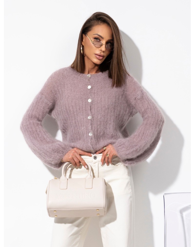Sweter zapinany na guziki na całej długości, wykonany z miękkiej dzianiny o delikatnej, prążkowanej strukturze. Model z długim rękawem o szerokim, lekko bufias­tym kroju, który nadaje całości elegancki i kobiecy charakter. Idealny do codziennych i bardziej stylowych zestawień.