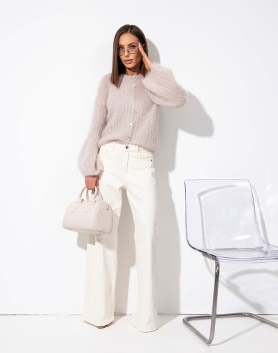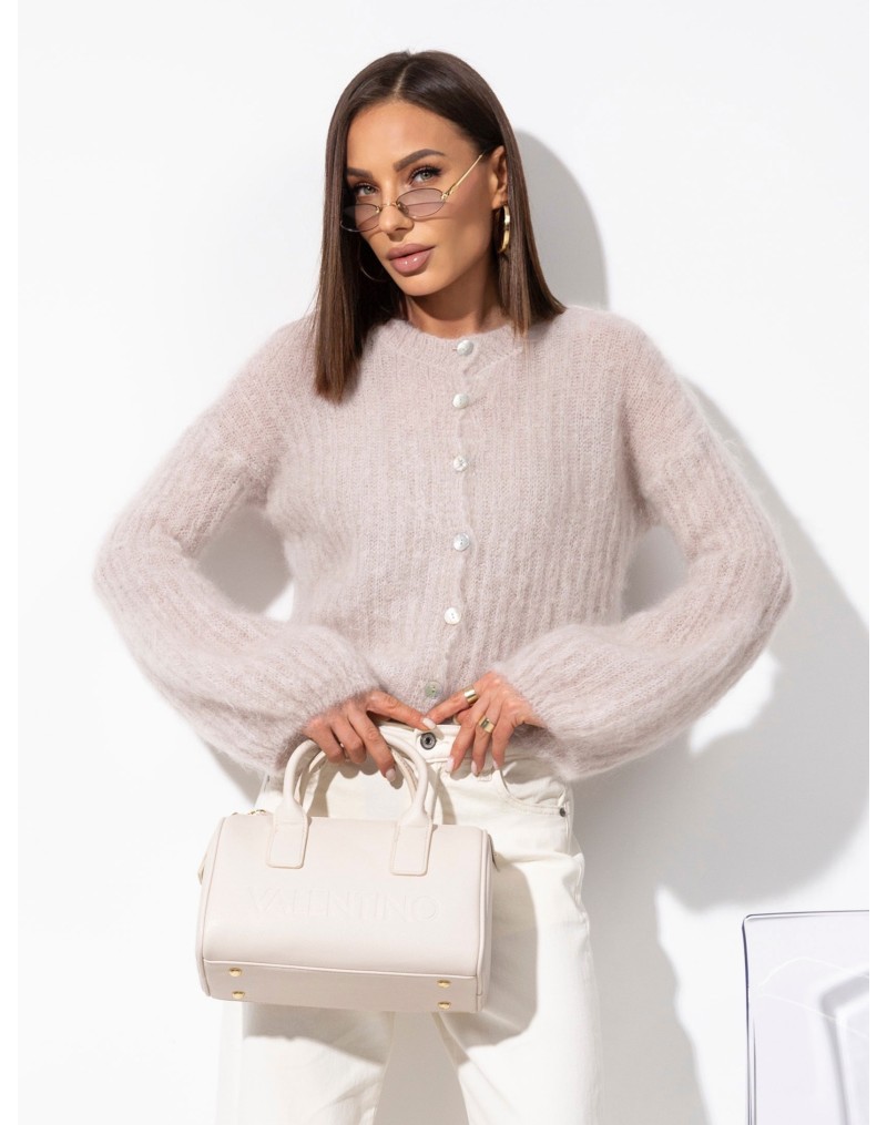 Sweter zapinany na guziki na całej długości, wykonany z miękkiej dzianiny o delikatnej, prążkowanej strukturze. Model z długim rękawem o szerokim, lekko bufiastym kroju, który nadaje całości elegancki i kobiecy charakter. Idealny do codziennych i bardziej stylowych zestawień.