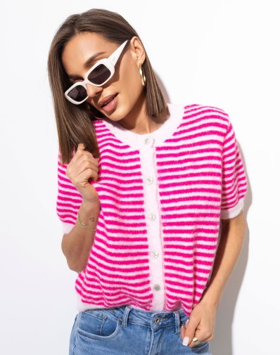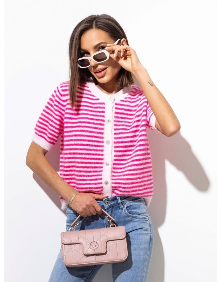 Sweterek damski zapinany na guziki na całej długości. Model z krótkim rękawem w różowe paski (jasny i ciemny róż), o klasycznym, prostym kroju.Wykonany z miękkiego, przyjemnego w dotyku materiału, który zapewnia komfort noszenia przez cały dzień. Dzięki ponadczasowemu fasonowi świetnie sprawdzi się zarówno do jeansów, spódnic, jak i eleganckich spodni.Uniwersalny model, który łączy wygodę z kobiecym, subtelnym akcentem kolorystycznym. Idealny na co dzień i do pracy.