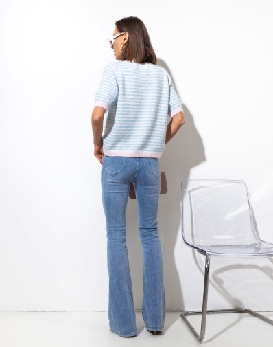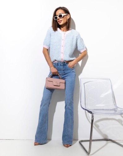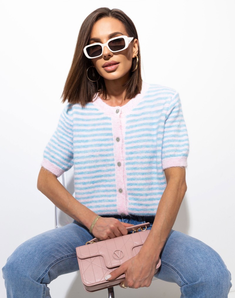 Sweterek damski zapinany na guziki na całej długości. Model z krótkim rękawem w różowe paski (jasny róż i błękit ), o klasycznym, prostym kroju.Wykonany z miękkiego, przyjemnego w dotyku materiału, który zapewnia komfort noszenia przez cały dzień. Dzięki ponadczasowemu fasonowi świetnie sprawdzi się zarówno do jeansów, spódnic, jak i eleganckich spodni.Uniwersalny model, który łączy wygodę z kobiecym, subtelnym akcentem kolorystycznym. Idealny na co dzień i do pracy.