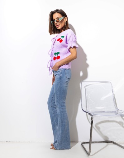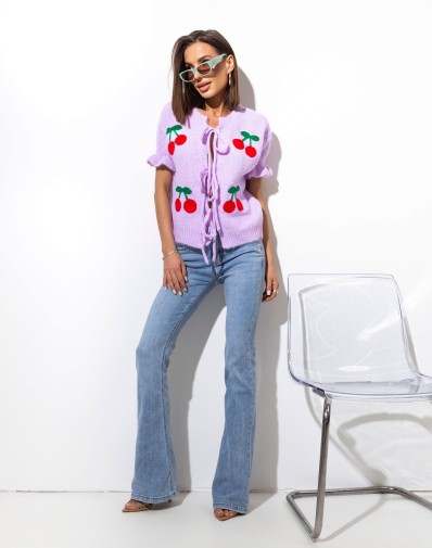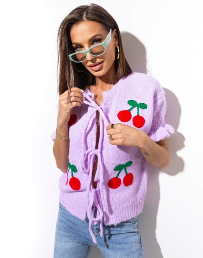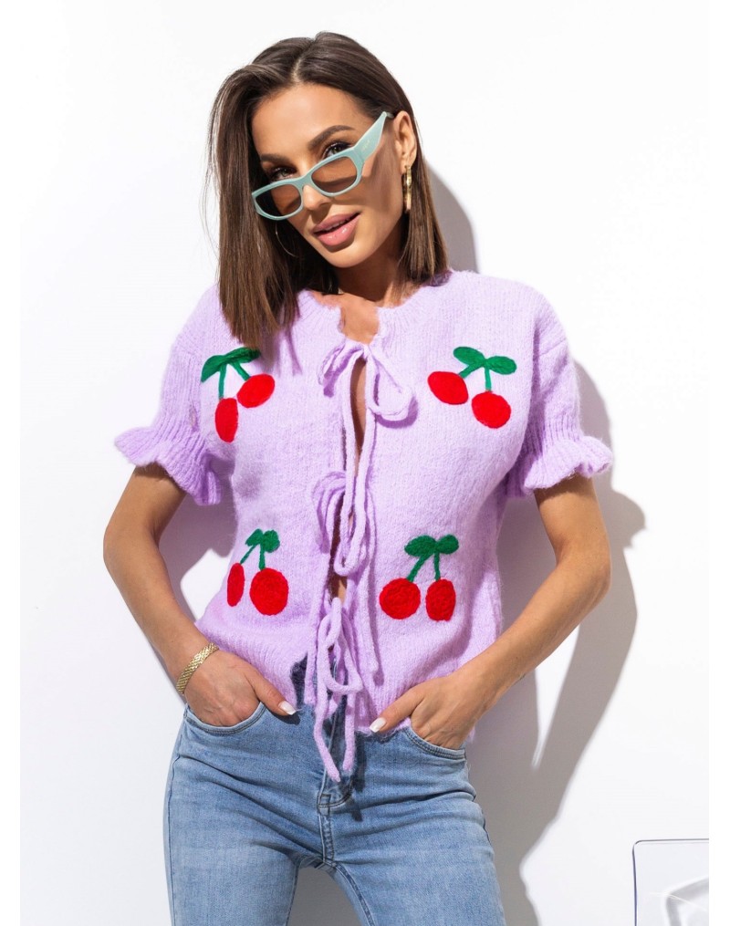 Sweterek damski o klasycznym kroju, zawiązywany z przodu na trzy urocze kokardki. Model z krótkim rękawem zakończonym delikatną falbanką, która dodaje mu lekkości i dziewczęcego charakteru.Na przodzie znajdują się wyszywane wisienki, które przyciągają uwagę i nadają całości oryginalnego, subtelnie romantycznego akcentu.Wygodny fason sprawdzi się zarówno w codziennych stylizacjach, jak i w bardziej kobiecych zestawach. Idealny do spódnic, szortów i jeansów.