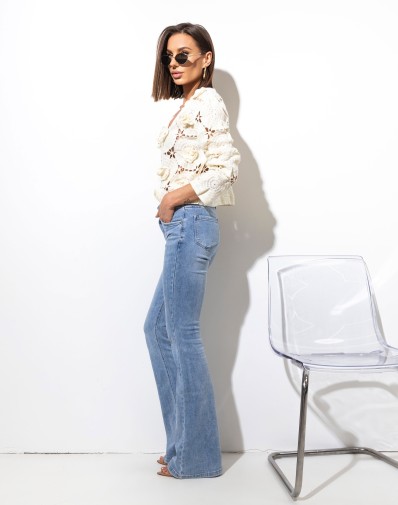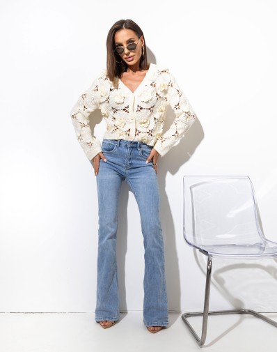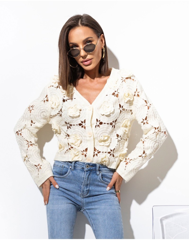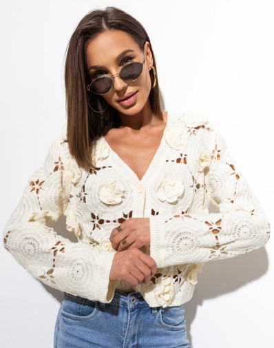 Kremowy, ażurowy sweterek o wyjątkowo kobiecym charakterze, wykonany z dekoracyjnej dzianiny 3D z motywem kwiatów. Krótki fason zapinany na guziki pięknie podkreśla sylwetkę, a subtelne wycięcia nadają mu lekkości i romantycznego uroku. Idealny do stylizacji z sukienką, topem lub do spodni wysokim stanem – sprawdzi się zarówno na co dzień, jak i na specjalne okazje.