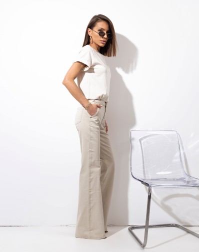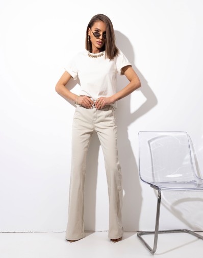 Bawełniany,klasyczny t-shirt o luźniejszym kroju. Dookoła dekoltu zdobią go subtelne kryształki, które dodają całości elegancji i wyjątkowego blasku. Wykonany z niezwykle miękkiego, przyjemnego w dotyku materiału, gwarantuje komfort noszenia przez cały dzień. Idealny zarówno do codziennych stylizacji, jak i na bardziej eleganckie okazje – pięknie prezentuje się ze spódnicą, spodniami czy klasycznymi jeansami.