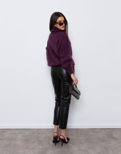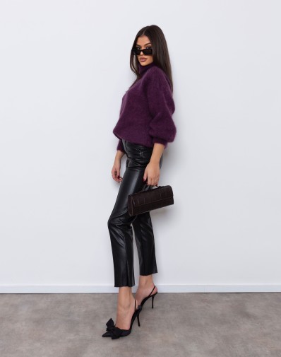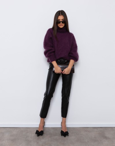 Miękki, oversize'owy sweter w odcieniu przepięknego fioletu to idealny wybór na chłodniejsze dni. Wykonany z grubego, przyjemnego w dotyku kid moheru , zapewnia komfort i swobodę ruchów. Posiada wysoki golf, który dodaje ciepła i stylu. Luźny krój i delikatnie opuszczone ramiona nadają mu modny, casualowy wygląd. Świetnie komponuje się zarówno z jeansami, jak i eleganckimi spodniami.