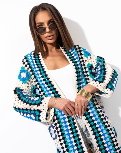 Długi kardigan o ażurowym splocie, który przyciąga uwagę efektownym, kolorowym wzorem. Lekki i przewiewny, idealnie sprawdzi się jako stylowe uzupełnienie letnich stylizacji. Luźny fason zapewnia swobodę noszenia, a jego długość optycznie wysmukla sylwetkę. Świetny zarówno na co dzień, jak i na wakacyjne wyjazdy.
