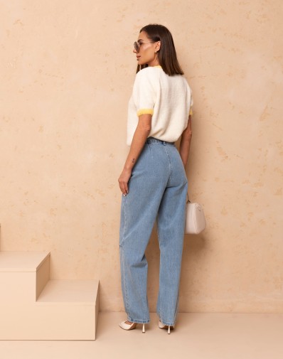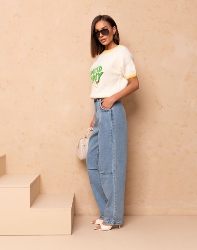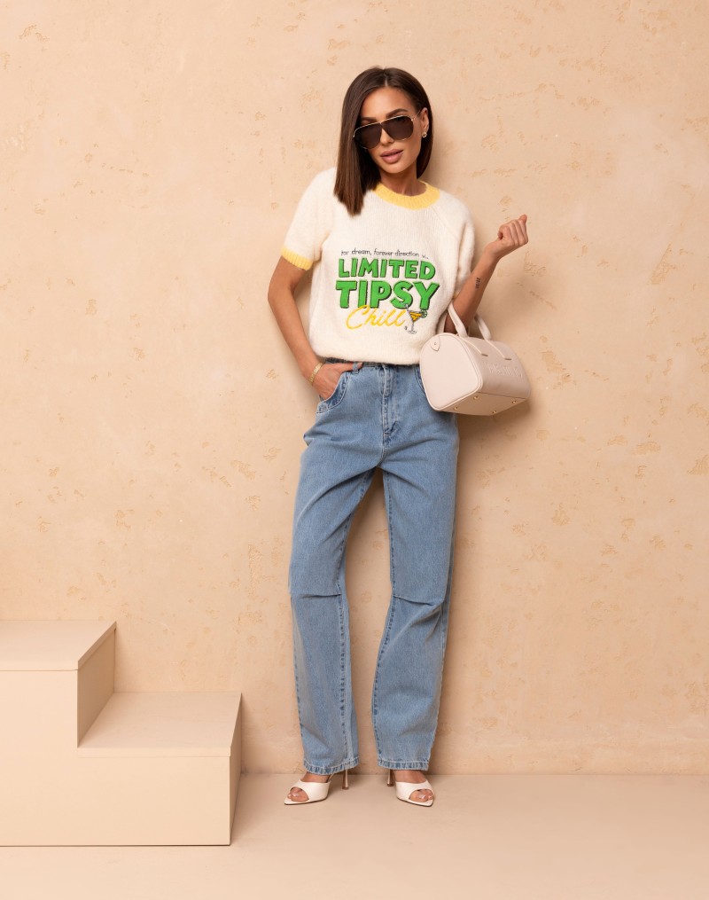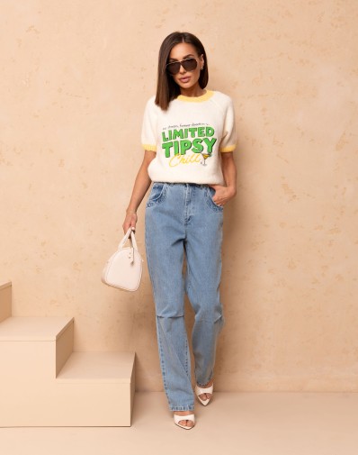 Sweterek z krótkim rękawem o klasycznym kroju, wykończony kontrastową żółtą lamówką przy dekolcie i rękawkach. Uwagę przyciąga subtelna aplikacja na środku oraz napis , która dodaje całości uroku. Idealny do codziennych stylizacji oraz jako akcent w bardziej kobiecym looku.