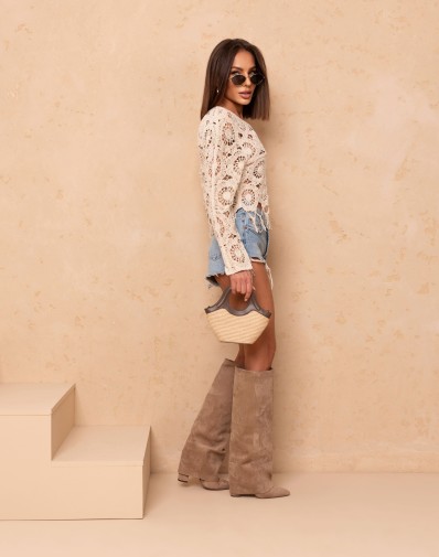 Lekki sweter ażurowy w odcieniu ecru, wykonany z dekoracyjnego, plecionego splotu. Model o luźniejszym fasonie z luźnymi rękawami zapewnia swobodę i komfort noszenia. Okrągły dekolt oraz efektowne wykończenia z delikatnymi frędzlami nadają mu wyjątkowego, boho charakteru.Zapinany z tyłu na guzik. Idealny do letnich stylizacji – świetnie wygląda zarówno z jeansowymi szortami, jak i zwiewnymi spódnicami.
